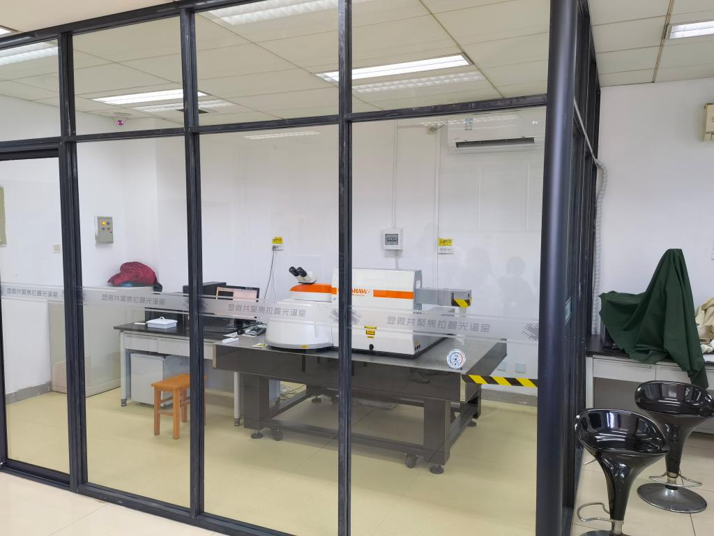 大型设备激光拉曼光谱仪因原存放位置存在灰尘污染、噪音振动大影响光路稳定性等问题而使用率低,故障频发。经院领导积极协调,实验中心与雷尼绍工程师充分沟通,最终确认方案在格物楼1113规划玻璃隔间,配备空调、除湿机、静电地胶以达到仪器防尘、恒温、恒湿的要求。于2021年6月初完成相关施工,配套设施安装并进行了仪器的搬迁。