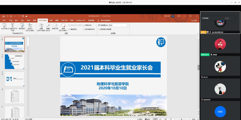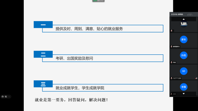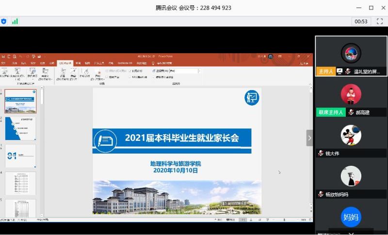 2021届毕业生就业家长会在腾讯会议平台成功召开。学院党委副书记郝高建、毕业班辅导员张思豆和毕业生家长参加了会议。