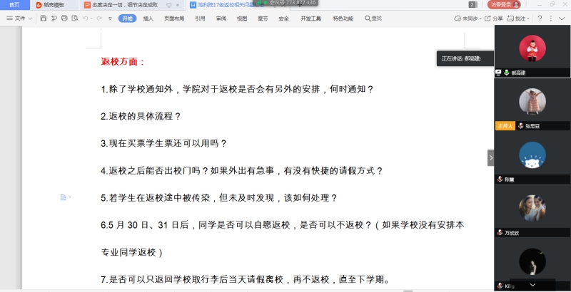 期间,各位老师就学生提出的关于返校时间、请销假等具体问题作了解答说明。最后,郝高建结合返校工作提出了几点要求:一是返校同学要认真学习学校的返校须知,严格按照要求做好返校前、返校中和返校后的各项准备及防护工作,确保身心健康;二是详细了解疫情防控期间相关规定和要求,遵守校纪校规及防疫期间的各项要求;三是要做好个人卫生和宿舍卫生,加强体育锻炼,增强体质;四是严格落实“一日三报”制度,主动做好“错峰就餐”“错峰洗澡”等环节;五是要加强沟通交流,遇到问题第一时间与辅导员及学院取得联系,便于解决。