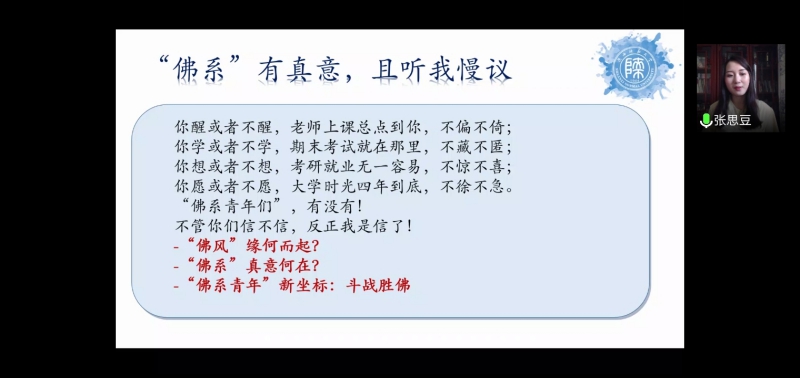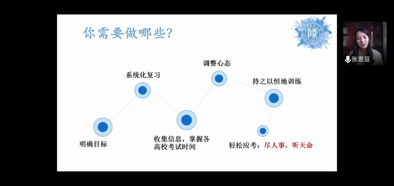 2017级辅导员张思豆跟大家分享了求职经验和感悟。她从高校辅导员、辅导员考什么、如何备考和工作体会等四个方面做了交流,为与会同学提出了建议:第一,要明确自己的目标并为之努力;第二要系统化复习,每个学校的招聘考试风格可能不同,一定要在收集信息的基础上,准确的复习;第三要关广泛收集招聘信息。包括往年招聘公告发布时间、招聘岗位、招聘人数,以及考试形式和内容等。第四要调整好心态,持之以恒的训练,学习政策文件,并善于运用政策“原话”,提高自身表达的精准性、理论性。