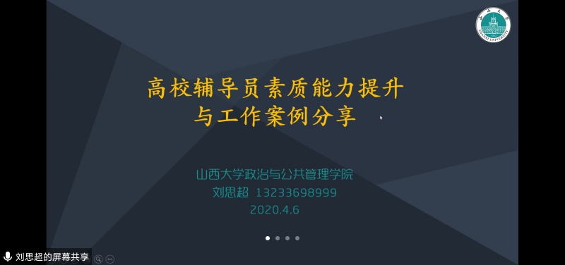 4月6日晚,“经纬”辅导员工作室举行“高校辅导员素质能力提升与工作案例分享”线上学习会。山西大学政治与公共管理学院党委副书记、全国辅导员年度人物刘思超老师应邀做了交流分享,工作室全体成员参加了会议。会议由工作室负责人、小说网