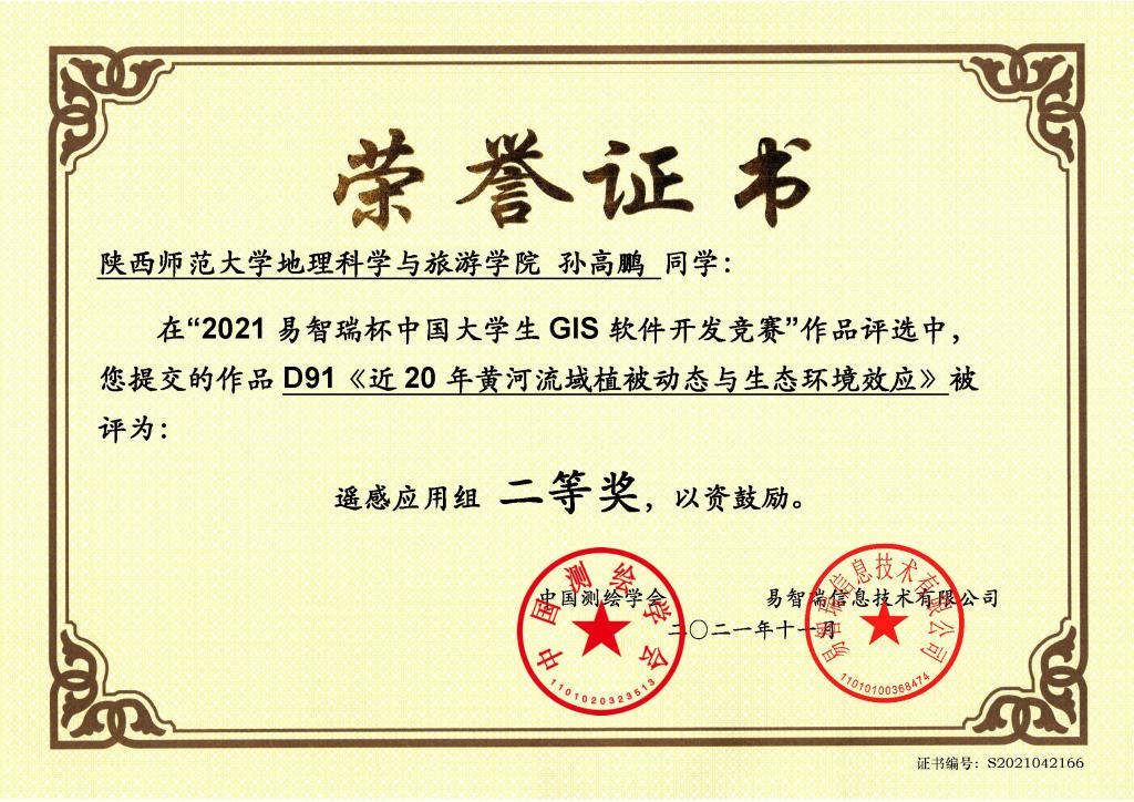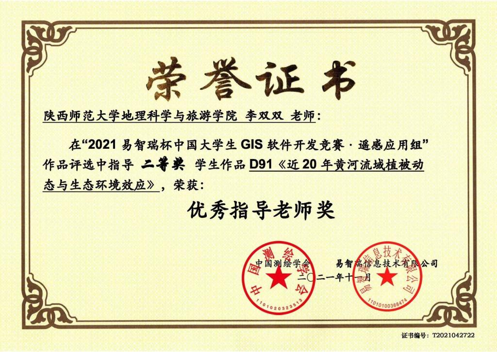 2020级硕士研究生孙高鹏、王小红和马慧榕,在青年教师刘宪锋和李双双的指导下,提交作品《近20年黄河流域植被动态与生态环境效应》,获得遥感应用组二等奖,刘宪锋和李双双被评为优秀指导教师。