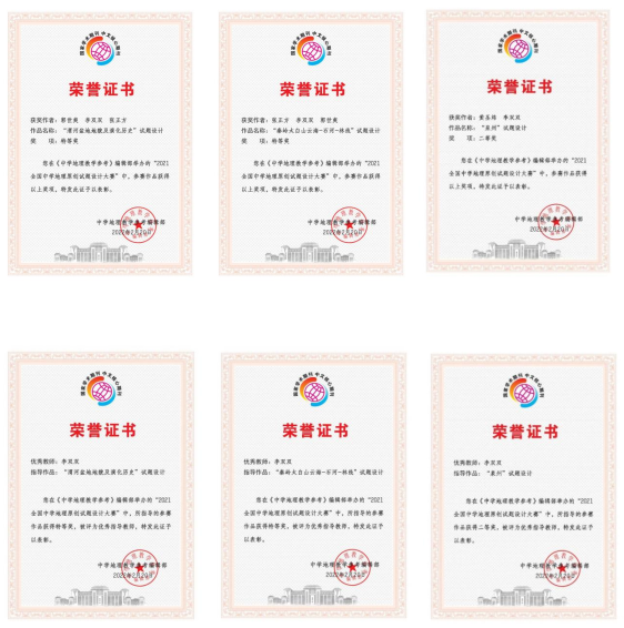 李双双老师指导下,经过精心的准备和设计,郭世爽同学的参赛作品《“渭河盆地地貌及演化历史”试题设计》和张正方同学的参赛作品《“秦岭太白山云海-石河-林线”试题设计》荣获特等奖,黄圣炜同学的参赛作品《“泉州”试题设计》荣获二等奖。李双双老师被评为优秀指导教师。