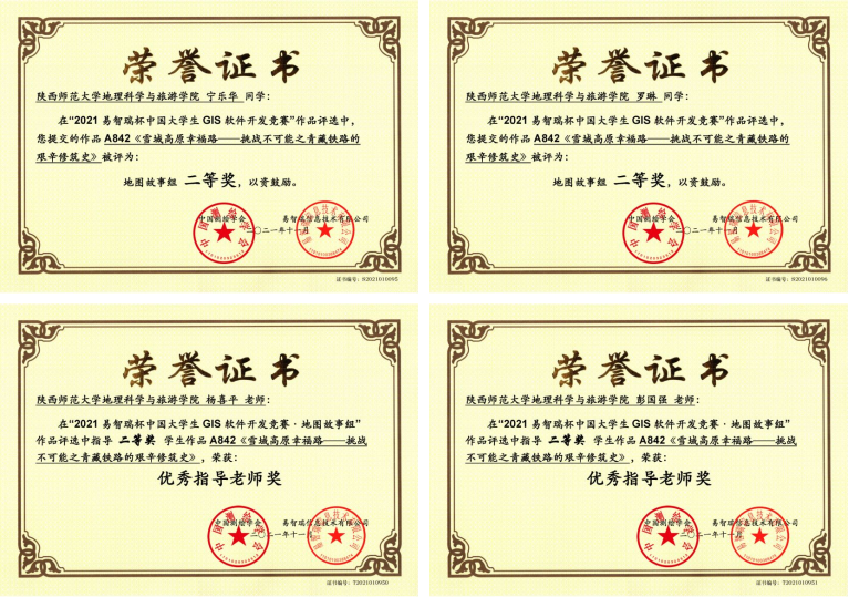 2019级二年级本科生宁乐华、罗琳,在青年教师彭国强和杨喜平的指导下,利用大二暑假时间,完成了作品《雪域高原幸福路——挑战不可能之青藏铁路的艰辛修筑史》,荣获地图故事组二等奖,彭国强老师和杨喜平老师被评为优秀指导老师。