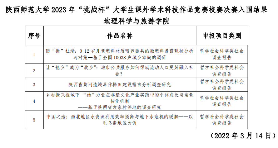 《让“他乡”成为“故乡”:城市公共服务对流动人口社会融入的影响及提升策略》获第十四届“挑战杯”陕西省大学生课外学术科技作品竞赛一等奖。