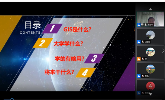 第一阶段的会议由李晶副院长主持,万剑华教授结合他多年来从事地理信息科学专业教学和科研经验,介绍了GIS的基本概念、主要技术,应用范围和发展前景,并回答了学生们的问题,使同学们了解了GIS领域的应用面和发展前景。讲座结束后,李晶副院长对报告进行了总结,并代表学院师生对万剑华老师精彩的报告表示感谢,表示等疫情结束后在适当的时间再次邀请万剑华老师莅临小说网
