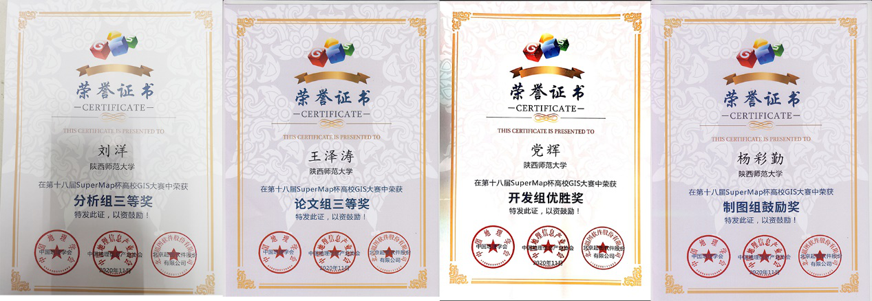 学子喜获三等奖2项、优胜奖1项、鼓励奖1项。其中2017级地理信息科学专业本科生刘洋、任佩、张雅、来洁的参赛作品《渭南市突发公共卫生应急医疗设施选址》获分析组三等奖,2018级地图学与GIS专业研究生王泽涛、王乐、于博的参赛作品《基于深度神经网络的多尺度土地类型分类算法研究》获得论文组三等奖,2019级地图学与GIS专业研究生党辉、张香峰、陈吉臻的团队参赛作品《方舱医院博物馆》获得开发组优胜奖,2019级地图学与GIS专业研究生杨彩勤、刘畅、王泽涛的团队参赛作品《陕西省榆林市生态敏感性制图》获得制图组鼓励奖。李晶、周毅、刘宪锋三位老师分获优秀指导教师奖。