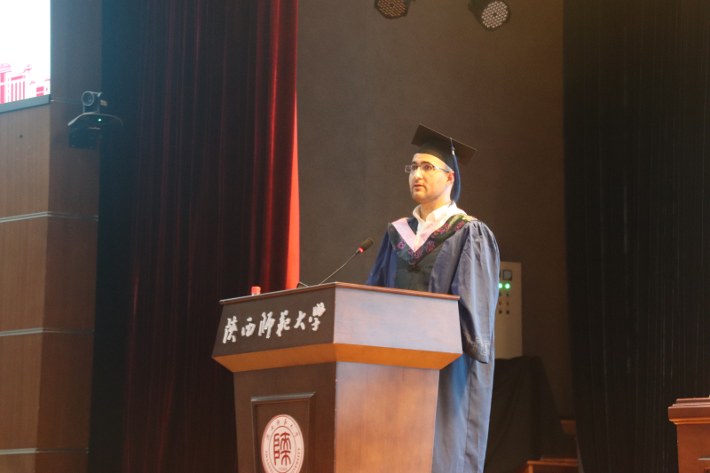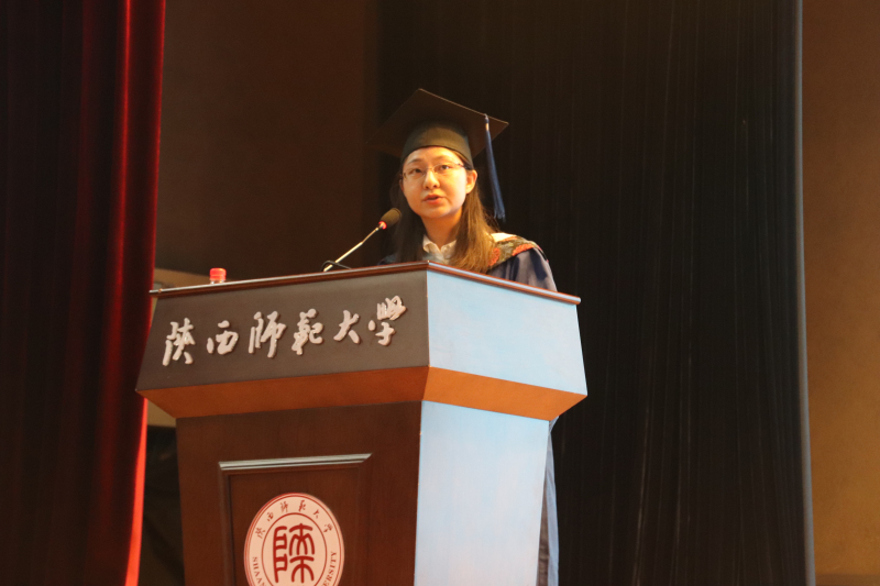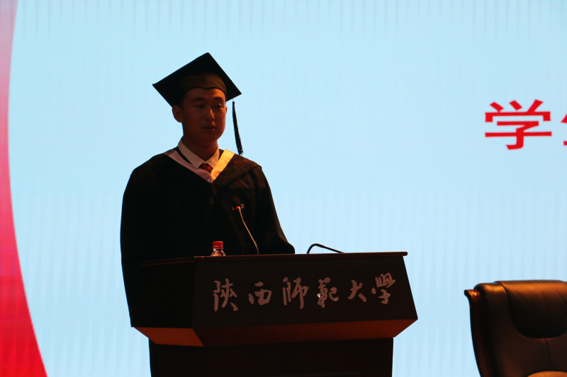拳拳学子意,浓浓地科情。三位毕业生代表上台分享了毕业感言和心声。来自土耳其的留学生代表张亦飞同学表示,在师大地科院学习生活的四年是最重要、最美好的四年,老师们的谆谆教诲和同学间的真诚友情是他永远不会忘记的珍贵记忆。研究生代表2017级人文地理专业毕业生王智燕同学回忆过往、感慨离别、期待未来、再约重逢,代表2020届所有毕业生向曾经为我们传道、授业、解惑的先生们郑重致谢,她动情的说:“地科院是江海汇流的人才聚集地,是培植理性思维和人文修养的精神家园”,“今日辞行,我们不说离别,只在师大相约。”2020届毕业本科生代表王沂重温地科精神、分享难忘瞬间,决心用传承与拼搏、修德与坚守回报母校回报学院。