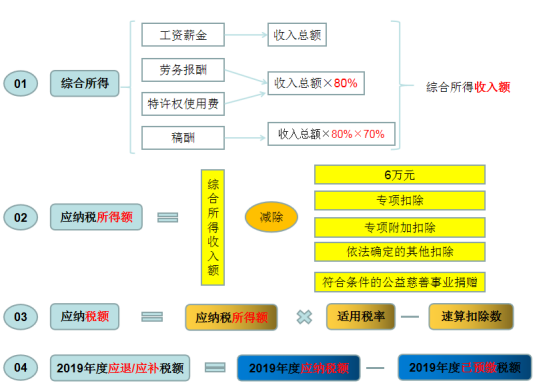 注:(1)专项扣除:指三险一金等;(2)专项附加扣除:包括子女教育、住房贷款利息、住房租金、赡养老人、继续教育、大病医疗共六项;(3)依法确定的其他扣除:包括个人缴付符合国家规定的企业年金、职业年金,个人购买符合国家规定的商业健康保险、税收递延型商业养老保险的支出,以及国务院规定可以扣除的其他项目。(4)税率及速算扣除数见“个人所得税税率表”。