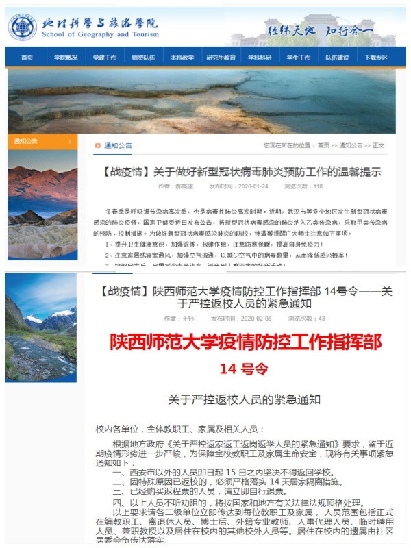 “一面党旗”率先垂范,共克时艰担使命。疫情发生,学院党委第一时间响应学校党委要求,印发《关于在新型冠状病毒感染肺炎疫情防控阻击战中发挥党支部战斗堡垒作用和党员先锋模范作用的通知》,号召全体党员要争当执行防控措施的表率、争当维护和谐稳定的表率、争当坚守岗位履职尽责的表率。学生党员、2019级自然地理学硕士生姜雨璇,本科生雷景铮、刘菲、杨云佳等同学积极参与社区、村委会的疫情防控工作。教工党支部党员在线上积极进行业务交流,为网上教学做好准备。