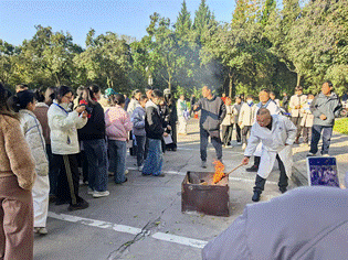随后,师生们积极参加了多项实战技能培训。在格物楼门前广场,专业人员详细讲解了灭火器的分类、使用原理及操作要领,并指导师生进行灭火实操;在格物楼北侧废弃物暂存间前,开展了危险试剂倾洒应急处置培训,演示了从警戒隔离、吸附收集到安全处置的全过程;在楼内各指定区域,还同步开展了生物安全柜规范操作、酒精灯安全使用、海姆立克急救法、应急喷淋与洗眼器使用等专项培训。系列培训内容紧扣实验室安全实际,通过理论讲解与实操演示相结合的方式,有效提升了师生们的安全自救与互救能力。
